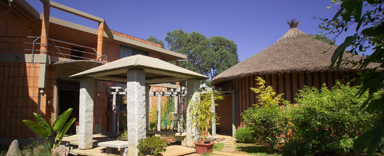 The academy is situated at 6500ft above above sea level on a mountain top, overlooking a breathtaking valley, rubbing shoulders with dense forest.Eco friendly architecture and ethnic architecture blend with the natural setting. Every minute detail has been thought through and designed for easy flow of work.
