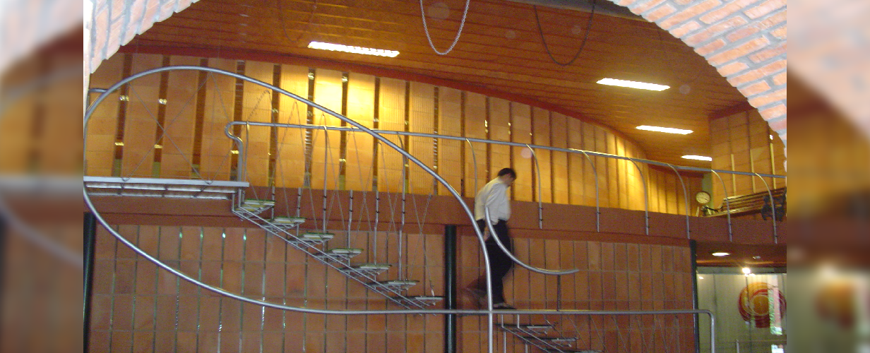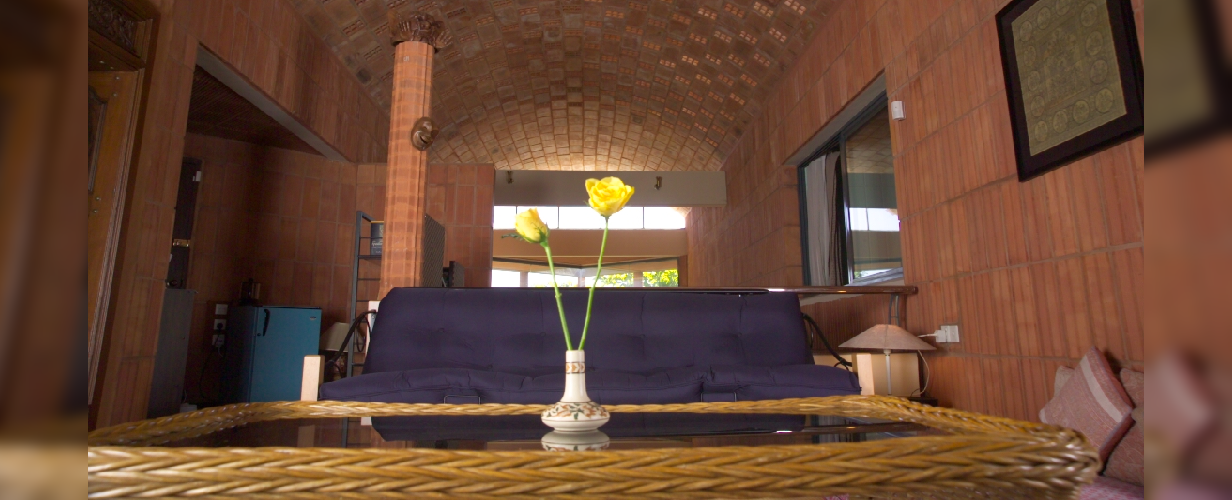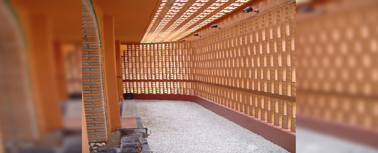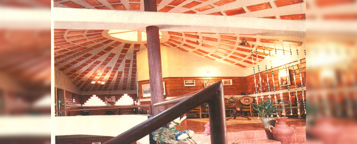 Taking advantage of the topography of Bangalore and the rear road drain and coaxing the local sewage board engineers to accommodate a little bit, the design evolved to hard construction. And for the FIRST time the HOURDI clay hollow extruded tiles of 8”x16”x6” was used ,to become the MATERIAL DICTATE of both structure and aesthetics. Laying a concrete platform and directly building the hollow tile walls married with deep recessed stonewalls the structure shell was formed. Here SIMHA steps in again and says his HERO is CHARLIE CHAPLIN. And of such chance remarks are genius born. The requirement of a structural column in the middle evolved to the Dream of CHARLIE caryatid floating on a reflecting pool and supporting through a cut out the upper floor slab, and to make matters more intriguing it was decided to eliminate the column at the upper level and float the entire roof over, with a volcanic cut in the middle crowned with a sunburst color fiberglass dome.