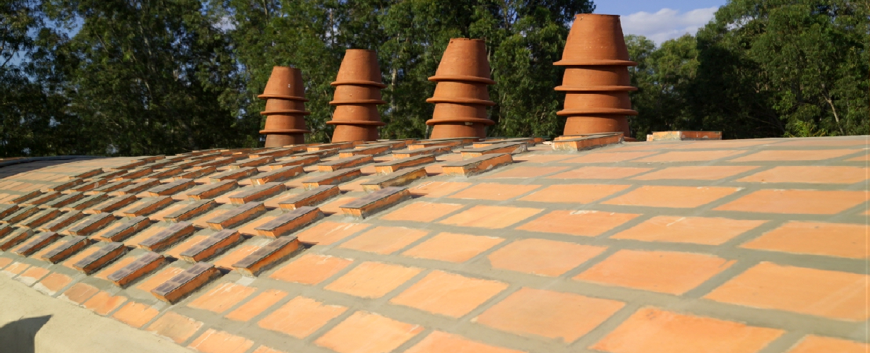 No known structural method was possible. An intuitional concept was taken and executed with sheer guts. The roof is a crowning glory. The rock selected to the design of the dome and collecting the tiles, designing the vents (windows what are they!) to every contour of the building and its environment was each magical and a challenge to surmount. (Incidentally there are no conventional windows, doors or roofs).
