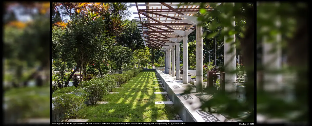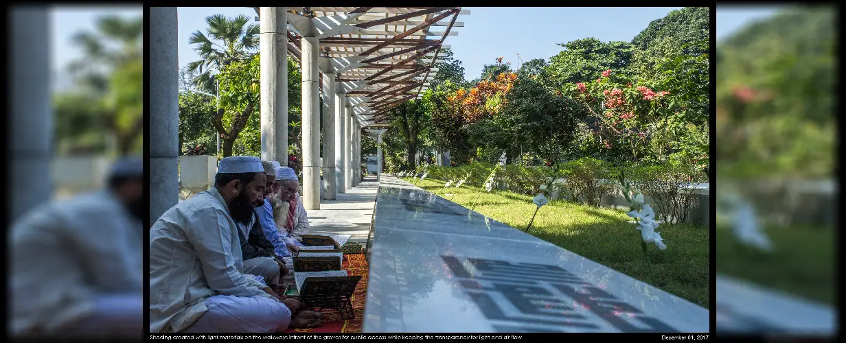 Another feature is the boundary wall. The boundary wall was designed to con-trast the traditional way graveyard boundary walls are designed. The bound-ary was transformed in to a work of calligraphy inspired from the Arabic word for “Allah”. Detail attention were given to the material, texture and lighting of the boundary wall. The boundary wall is lined with plants like kolaboti (canna indica) and katamehedi (duranta repens) which gives colour to the monochrome wall and is a highlight of the design that merges the wall with the landscape.