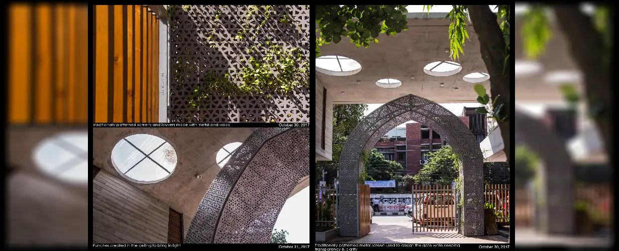 Minimalistic approach with detailed design was the basis for the rede- sign of the Banani Graveyard and Mosque. Materials such as concrete, wood,natural stone, and metal were used throughout the project. Islamic patterns made of concrete and metal were used in designing the gate, window screens and dome. Metal frame and poly carbonate sheet was used to lighten the tra-ditionally, heavy symbolic dome of a mosque.