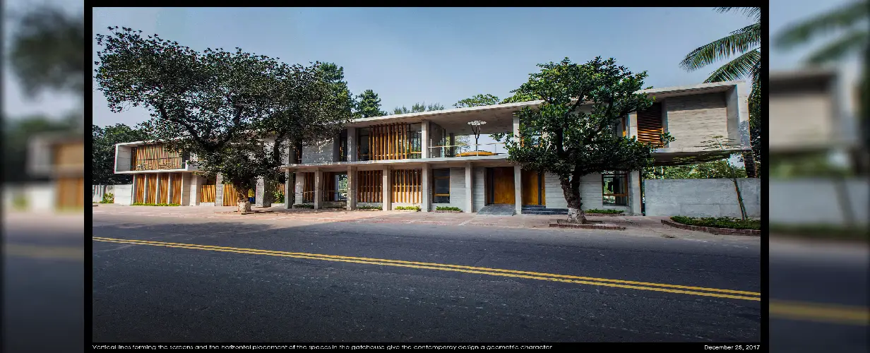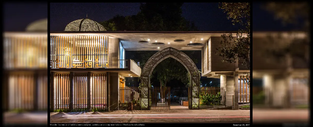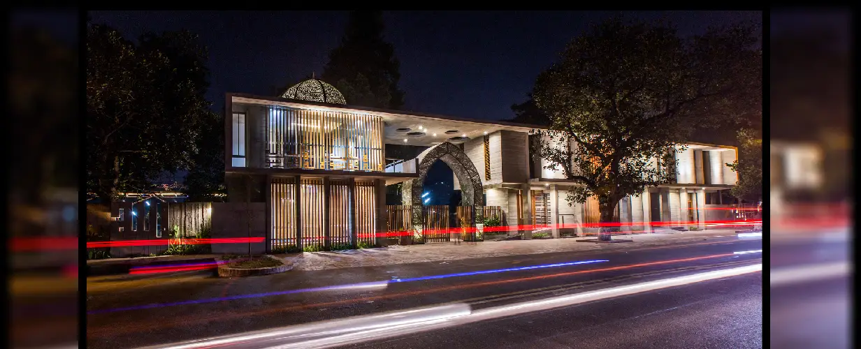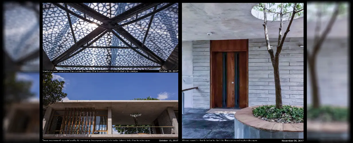 To further complement the design, purity of material expiration was pre- served by means of material honesty and clarity. Fair face concreate were used for the mosque and boundary walls were complemented by the warm feeling of wooden texture used for the louvers and screens.