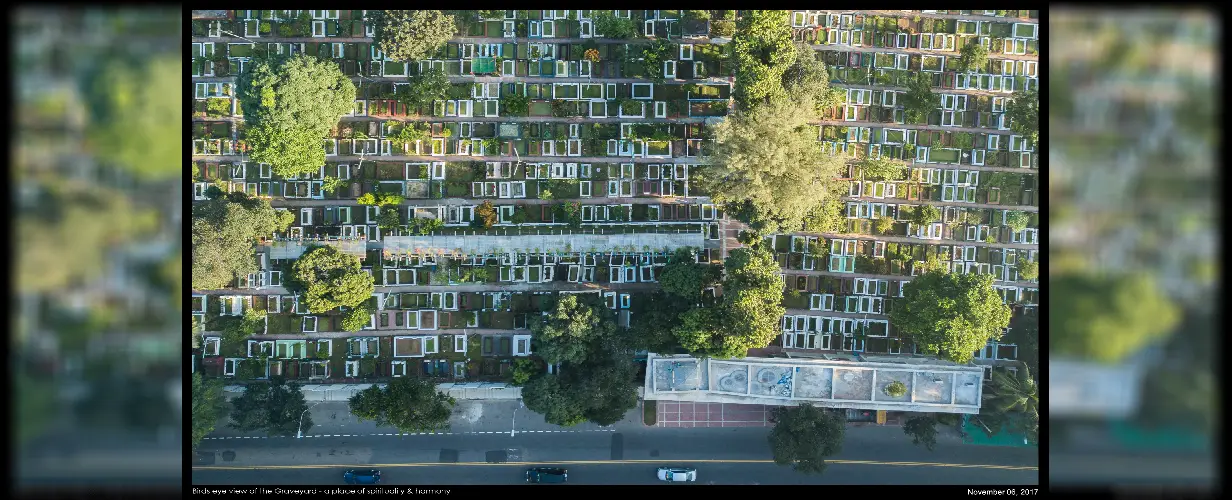 Landscaping was based to keep the graveyard a place of spirituality and har-mony. Sitting areas plays an important key roll and are carefully placed on the nodes of the aisles. These contemplation spaces have an immense effect on the intangible spaces and the overall services of graveyards. Green creepers were designed along with sitting areas throughout the graveyard integrated into the landscape.