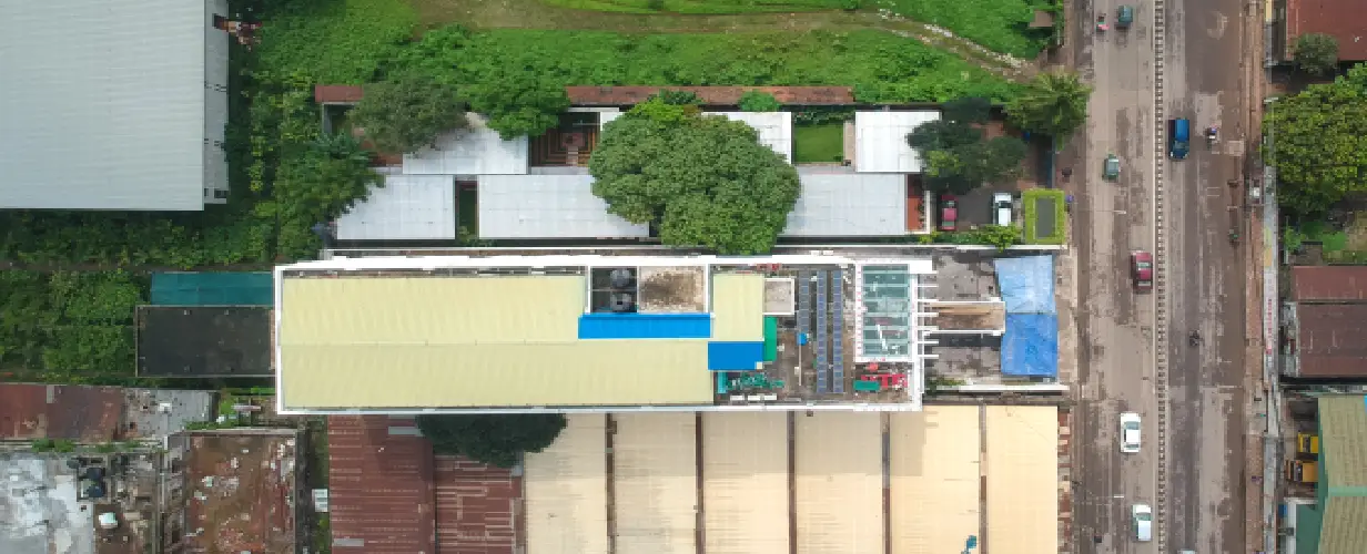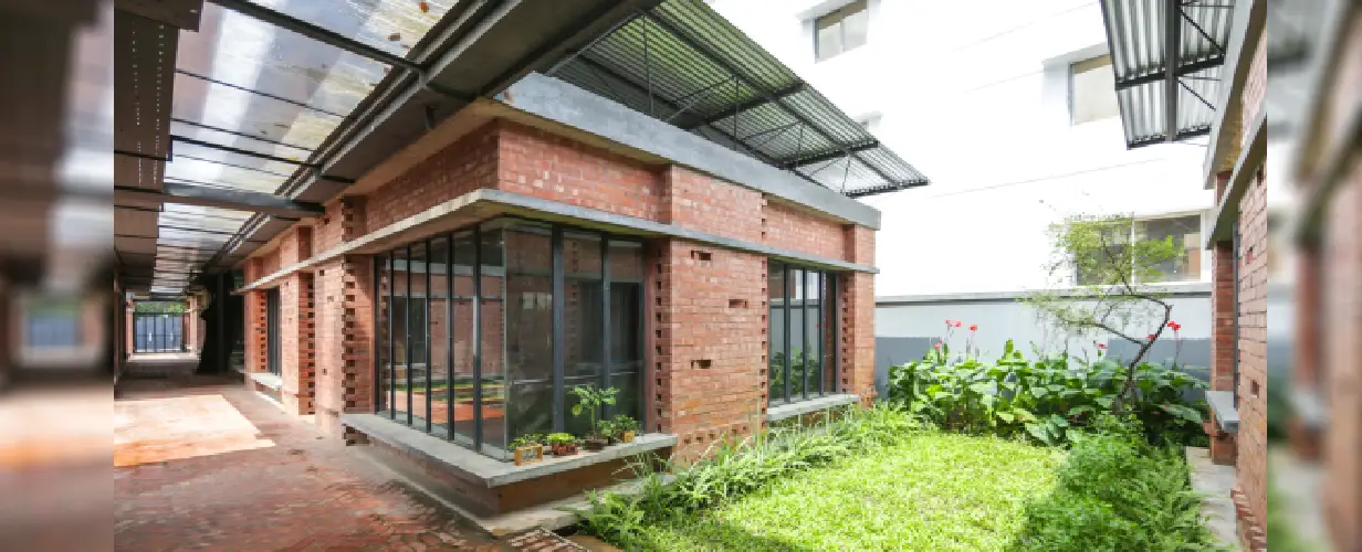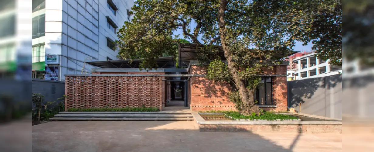 The project is located at the densest commercial area of Dhaka city. It stands out from the surrounding corporate shiny high-rise buildings in its very humble and down-to-earth structure. As it goes, the edifice and the character of its spaces stand out in the utilization and interplay of natural resources like trees, plants, waterbody, the sun, wind, rain and shadows. The architectural volume goes green rather than being a glass and concrete corporate building. This way bricks, corrugated steel sheet, custom-made mild steel frames for all the openings and cement finish floors take over expensive materials to adorn the structure with environment-friendly materials.