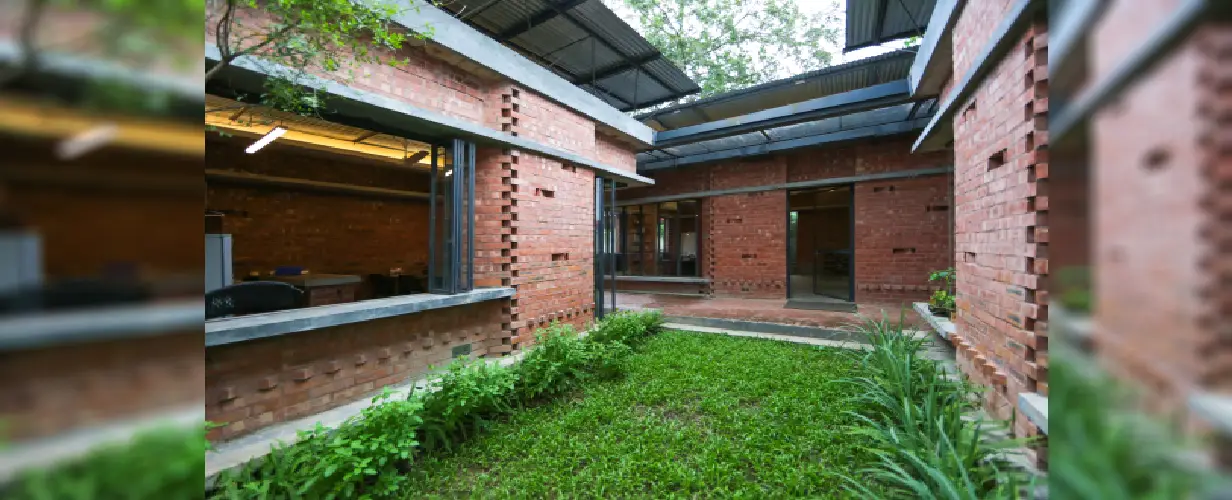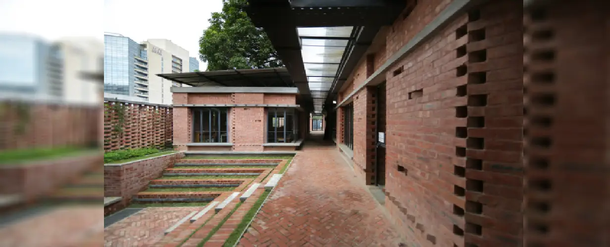 The materials used in the project are environment-friendly. The provision for perforated brick screen walls was kept to let in free-flowing air all over the usable spaces. Local gas burnt bricks have mostly been used for construction. Silicon coating has been provided on top of the brick walls to make it more maintenance free. Brick dust mixture with pointing cement was a deliberate decision to render it an earthy elegance. These especially-designed brick screen walls also resemble the weaving pattern to represent the concept of the whole compound.
