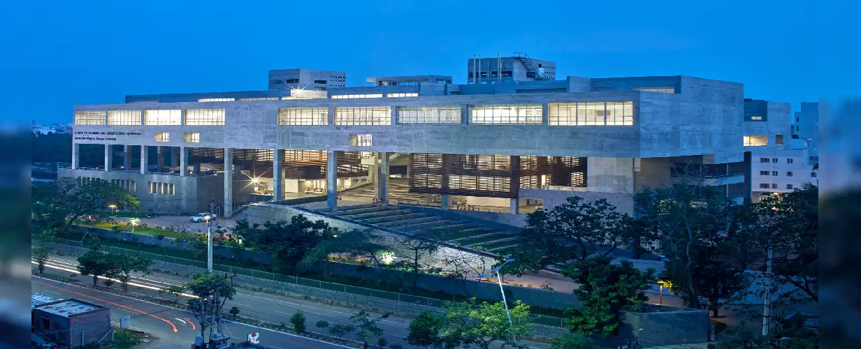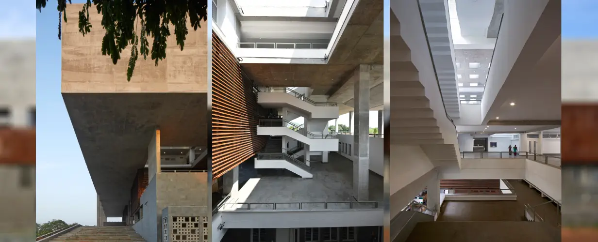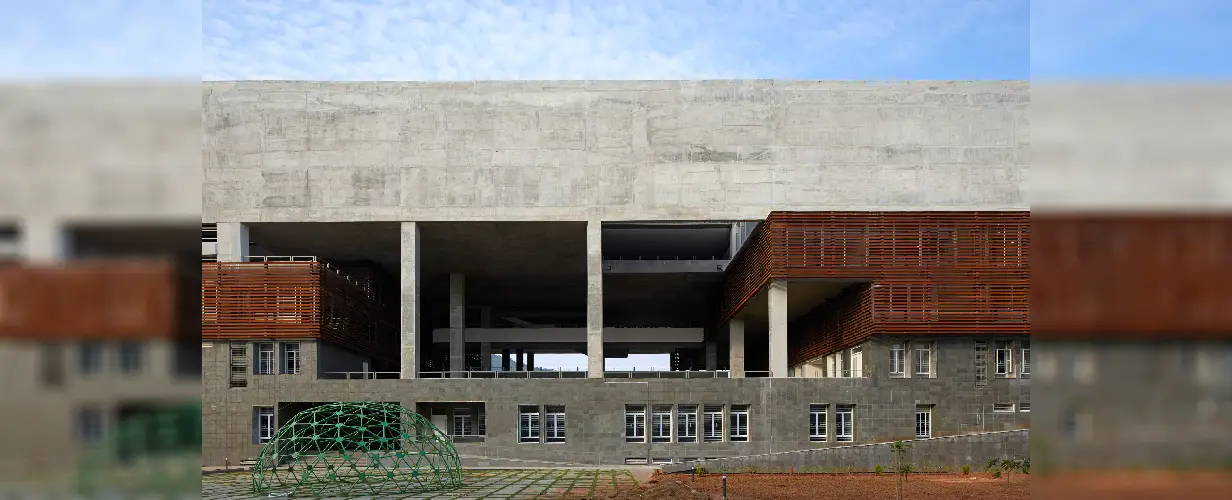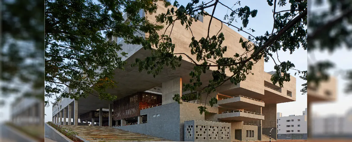 The building demonstrates responsive environmental architectural concerns through passive design strategies for an extreme hot and humid climate of Vijayawada.
