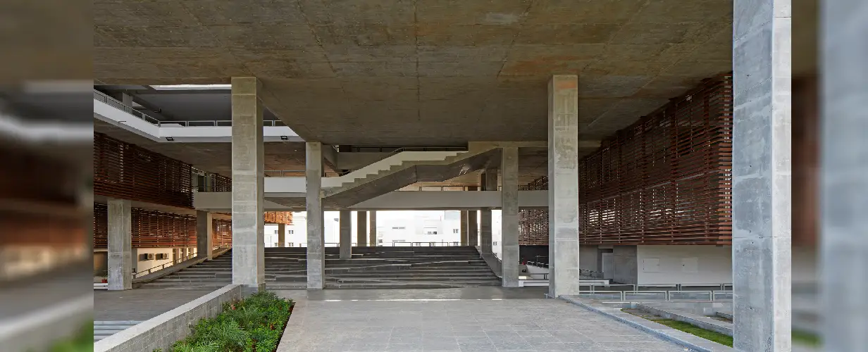 The concourse is connected by multiple amphitheaters and stairs creating a platform for people, thereby making the architecture both interactive, inclusive and socially sustainable. The boundaries of the inner spaces are blurred to initiate conversations across the corridors, double height spaces and through voids. The voids of the building form visual connective networks across departments of architecture and planning schools dissolving the floor wise stratification of the building by spatially connecting programs with stairs in varied configurations across the section of the building.