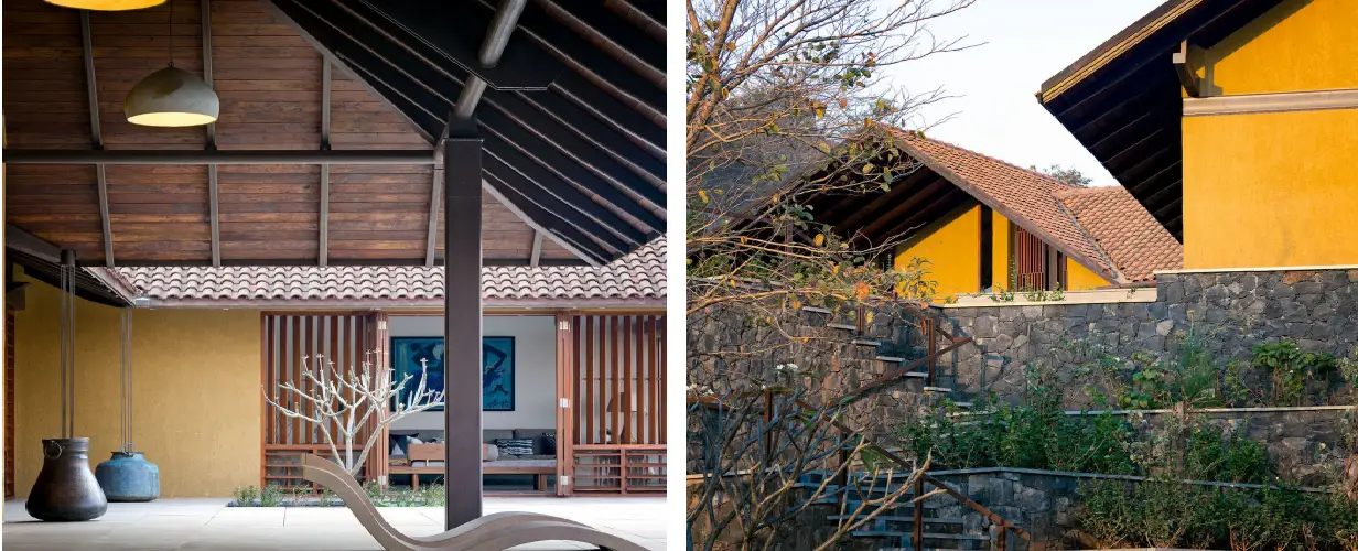 The house uses a natural stone palette alongwith plastered surfaces. A red laterite wall is the constant feature along the light courts as one moves from the parking through the house to all bedrooms and acts as a backdrop. The house sits on a black basalt random masonry base over which the roof casts deep shadows onto the plastered surfaces. A white sandstone in varying textures is used as a flooring throughout the house and integrates the interior and exterior of the house through the stone finish. The Mangalore tile roof with a teakwood soffit finish from the inside and the wooden doors and windows compliment well with the off-white stone flooring to create a seamless experience across the project. Copper roof gutters are used only where necessary along with a copper bucket down-take system that enhances the experience during the rains. The steel structure for the roof is articulated to accommodate the special features of the roof shape and