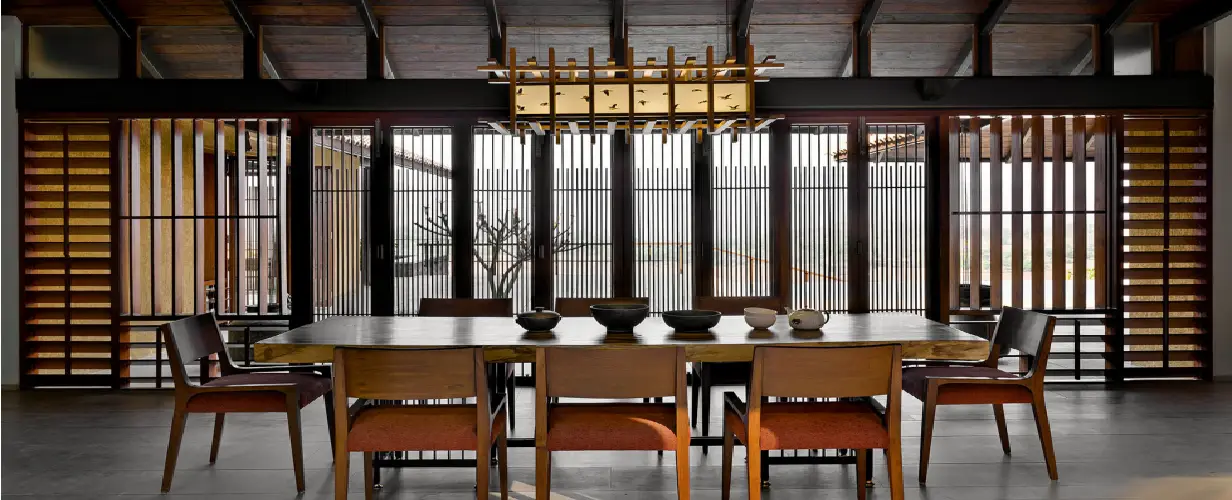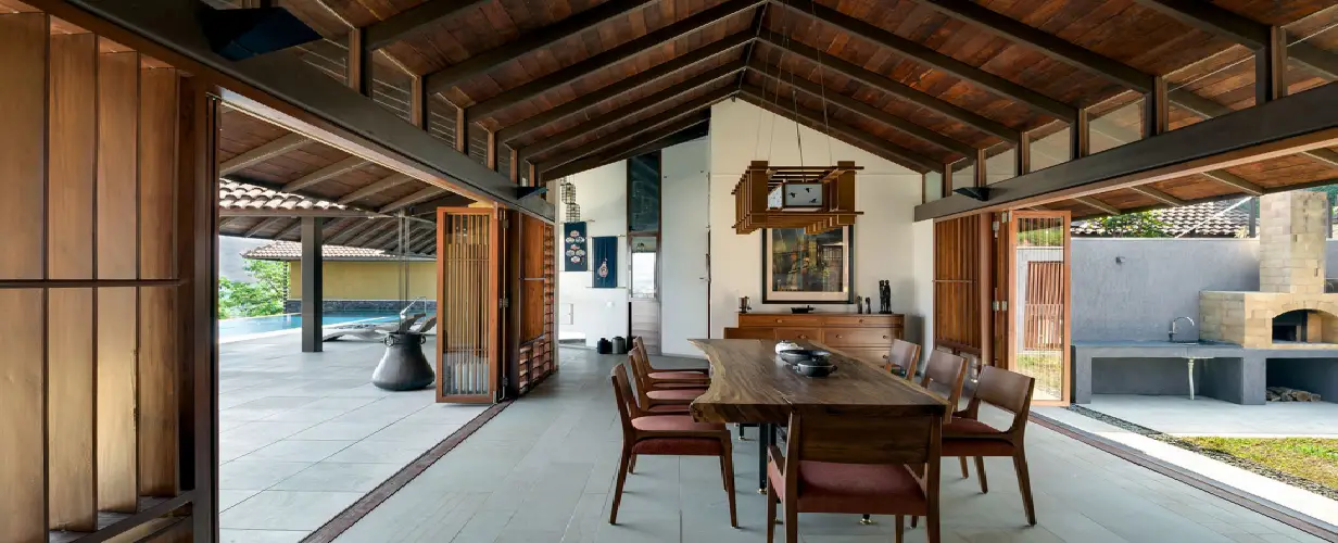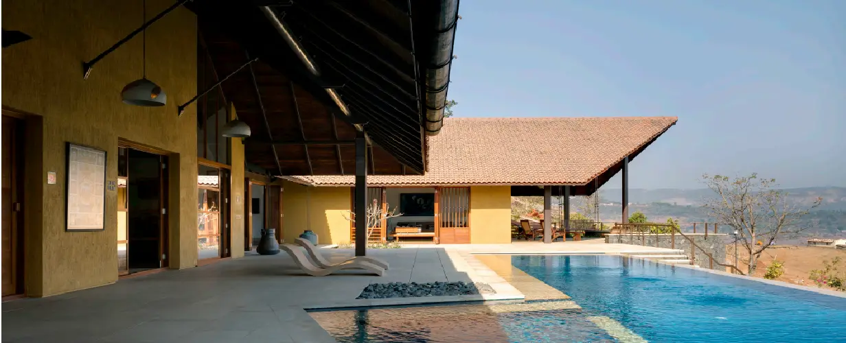 The house creates a microclimate for itself with the use of light courts that also provides adequate ventilation throughout all the spaces. A raised stone deck flooring (open jointed) ensures the interior /exterior spaces are seamless in their grade changes and eliminates a conventional plinth in this heavy rainfall region. Each room commands views of the lakes and dams and the house has a clear orientation towards the views with the infinity pool and surrounding deck being the center around which all the activities are arranged. A solar farm produces all the energy needs of the house and the house is off the main electrical grid. Water recharge pits harvest all the rainfall within the courts and the clever uses of retaining walls reduces the water run-off and ensures percolation of ground water. The continuous modulated roof with its large overhangs adequately protects against the swirling and angular heavy rainfall characteristic of the region and ensures complete water tightness for the entire house. A clever use of the RCC slabfor the parking helps integrate with the hillside and makes the car park disappear on the approach. The louvered windows (both horizontal and vertical) ensure control and modulation of light for interior spaces along with adequate ventilation.