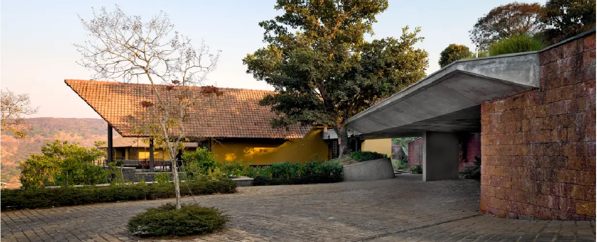 The project for a couple in their late 50’s is located at Panshet (outskirts of Pune) overlooking the Panshet and Varasgaon dams. The site is steeply contoured and access to the site is from the top with the view in the background. The house is located primarily at one level with only one guest room tucked below the living room verandah. The house nestles itself amidst the slopes and helps negotiate the level differences from west to east (5 M) and from south to north (almost 20 M).