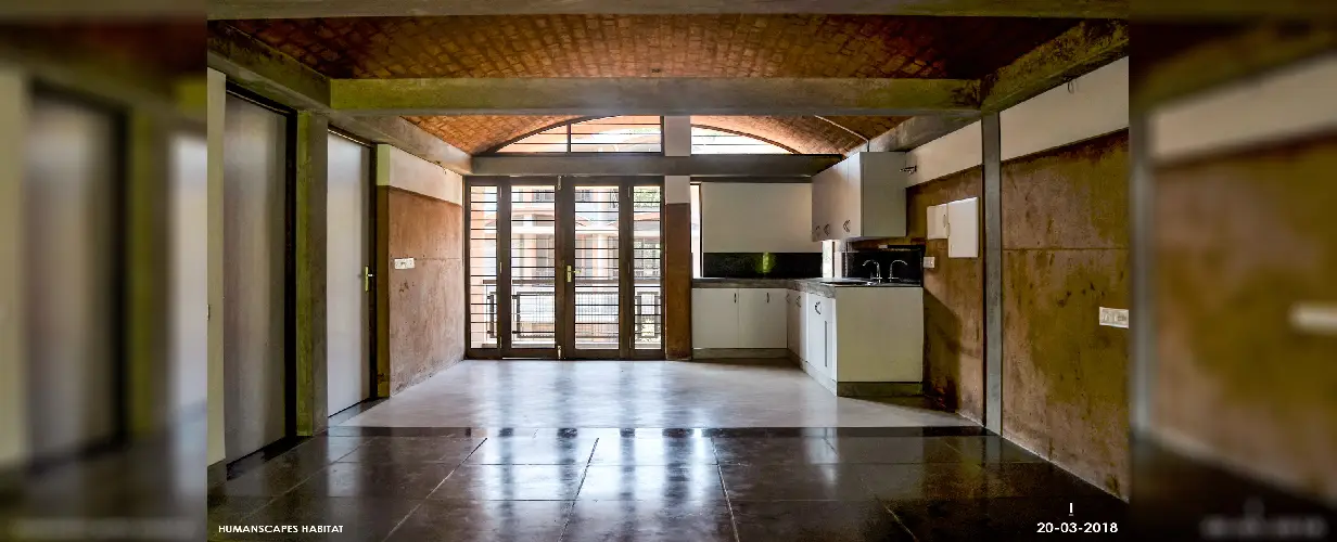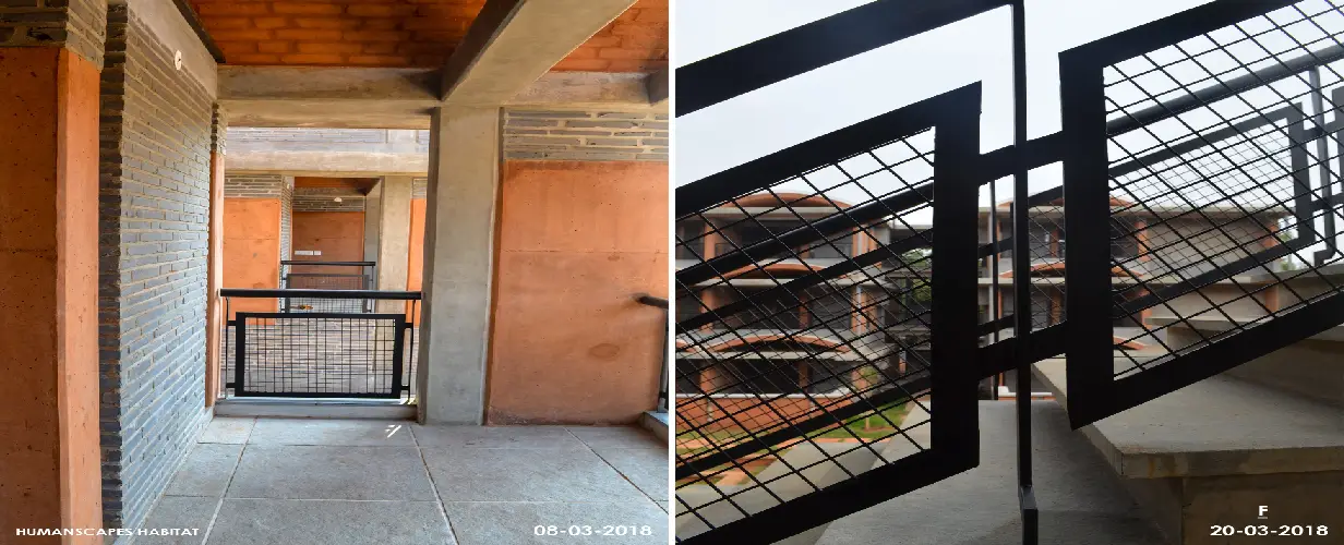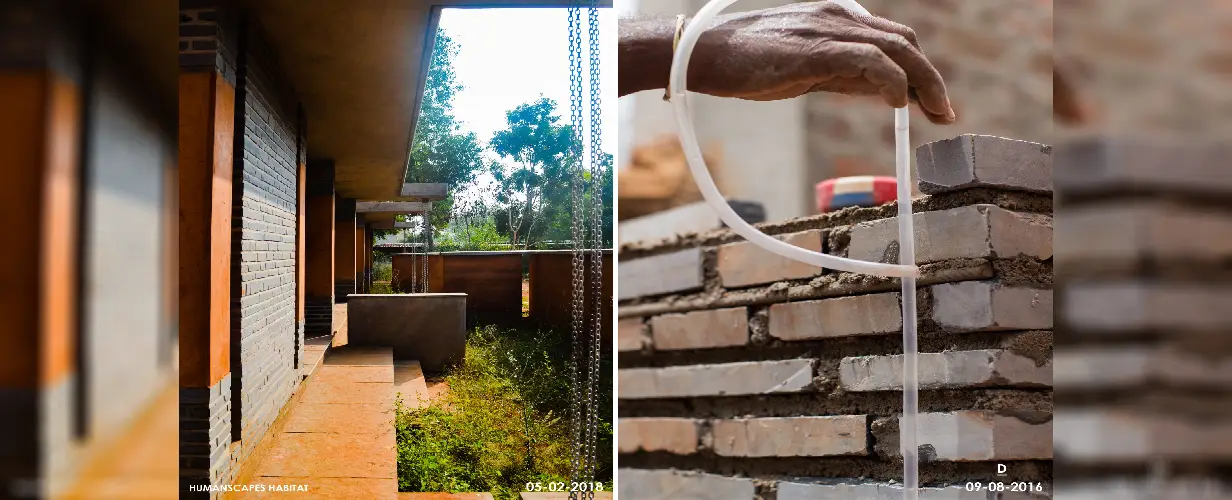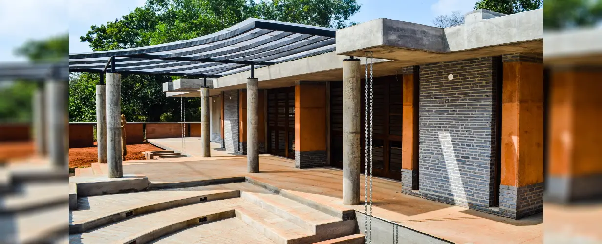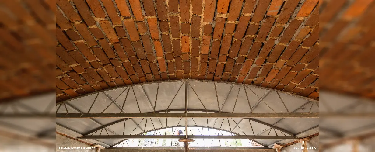 Materials of Construction Details – The building was designed to ensure that the structure use of low steel concrete structures by adopting segmental arch vaults in bricks as roofing with walling in Poured Earth Concrete (PEC) and recycled cuddapha. The excavated land on site are formed into bio-swales as the rain water harvesting structures, reducing the embodied energy along with lowering the carbon miles for the earth used in walling. The waste cuddapah stone strips reused in walls, address the issue of landfills caused by the stone factories. Shredded thermocol is used as under the floor filling for insulation.
