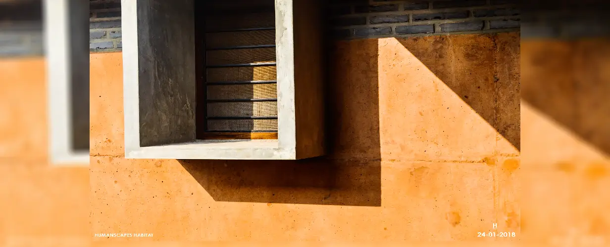 The buildings are designed to vent hot air during day time and allow cooling in the evening. The large overhanging roofs have roof level vents to flush out the heat by being combined with openings at floor level to induce cool air entry.