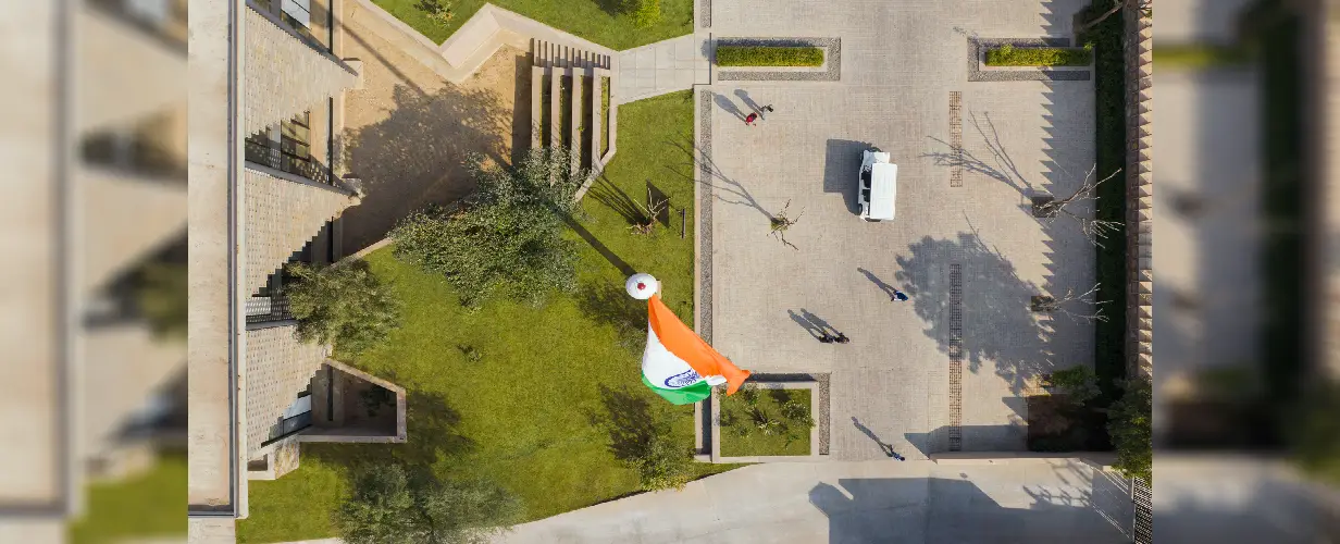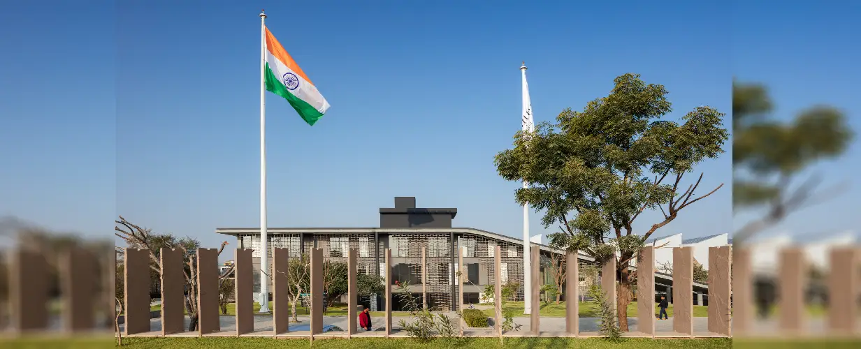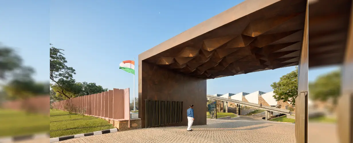 Prefabricated white metal flutters give the entire structure a buoyant profile, when looked at from afar. The stone buttresses make the building appear grounded at a more proximal viewing. The sides facing east and west are mostly blank, barring the small windows that connect the occupants with the surroundings. The windows also create a wind draft across the height of the shed expelled through the ventilators along the north light trusses therefore avoiding hot pockets at the top and effectively cooling the building by about 10-12 degrees. The building is designed such that the spaces are used judiciously, allowing for maximum possible green cover and soft scaping. Other sustainable measures include the use of bio STPs that recycle waste water and use it for landscaping and flushing toilets, 100% rainwater harvesting that keeps the groundwater table recharged and soft scraping inside that aids the creation of shaded areas to create a microclimate and keep overall temperatures of the facility low.