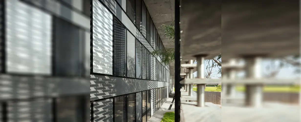 The skin of the Office building sandwiches a puff panel between two laminam panels to further insulate the interiors. The façade is complimented by an enveloping stone screen that is fabricated using the waste stone from a nearby quarry and the stone wastage that is generated on site. This screen provides solar shading from the south-east and west glare. A playful, visual appeal is created by the light and shadow of interwoven stone blocks that appear to be floating at different levels.