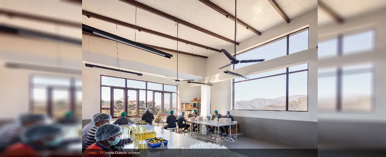 Unique: A rectilinear volume oriented along the East-West axis was planned with a central entry that divides the facility into two parts. Functions requiring a cooler environment such as herb grinding, packaging, and storage are located on the upper floor while functions with high-internal heat-gain are located below. The North-South oriented butterfly roof form allows large openable windows taking advantage of the prevailing Northeast and Southeast winds for ventilation with 80% naturally daylit spaces and unobstructed views of the valley. The high-volume of space with clerestory windows enforces Bernoulli’s principle and helps moderate indoor temperatures. The courtyard inspired from the ‘kholi’ is covered by glass blocks to meet production standards and provide a well-lit central communal space. Passive design and indigenous construction techniques give a strong architectural expression to the building.