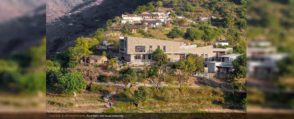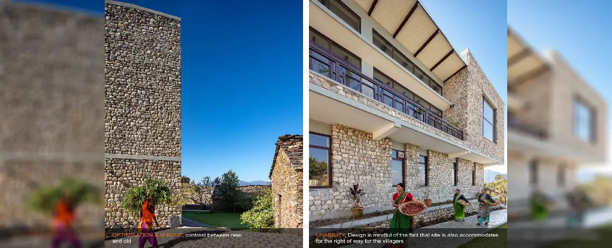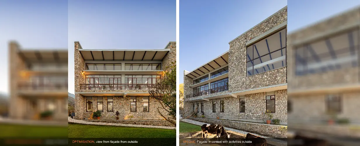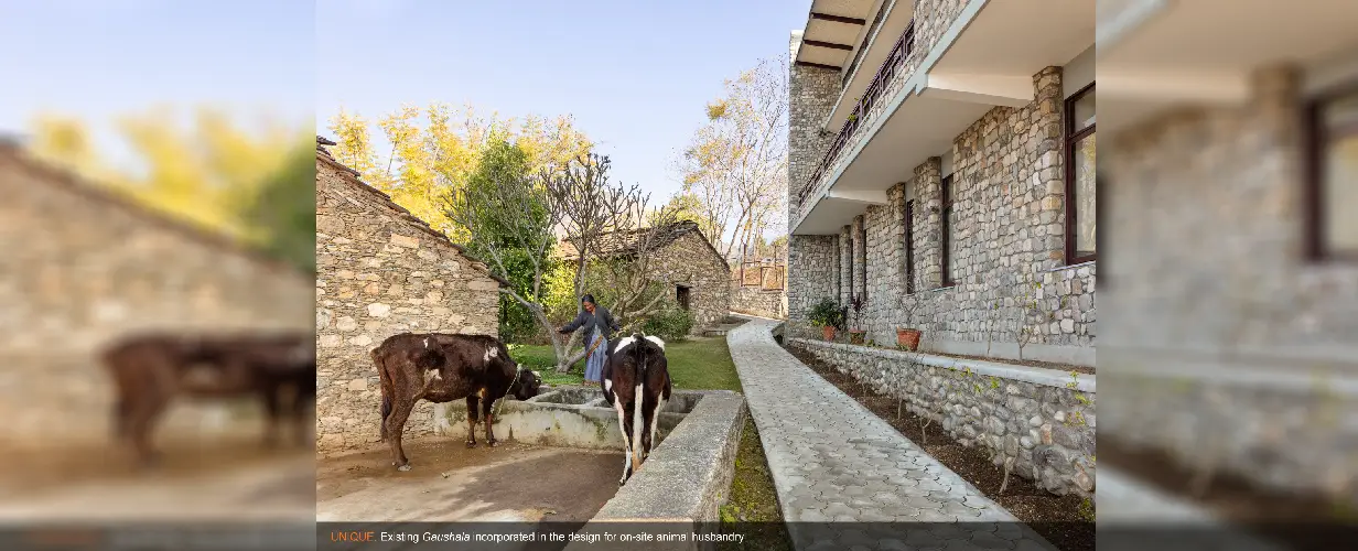 Optimisation: The facility is designed to sit on the natural contours, lowering the need for cut and fill significantly. Using excavated stone from the site for construction, minimising site waste reclaiming the wooden and metal rafters for light fixtures, reinforcement bars as wash basin pedestal and stone chisel for door handles. This leads to resource optimization while developing a design that responds to the context and the community. All by-products are either reused or used for composting. This results in a building that is net-zero on energy, water, and waste. The existing ‘gaushala’ (for animal husbandry and production of milk-based products) was incorporated in the planning and augmented with a community gathering space.