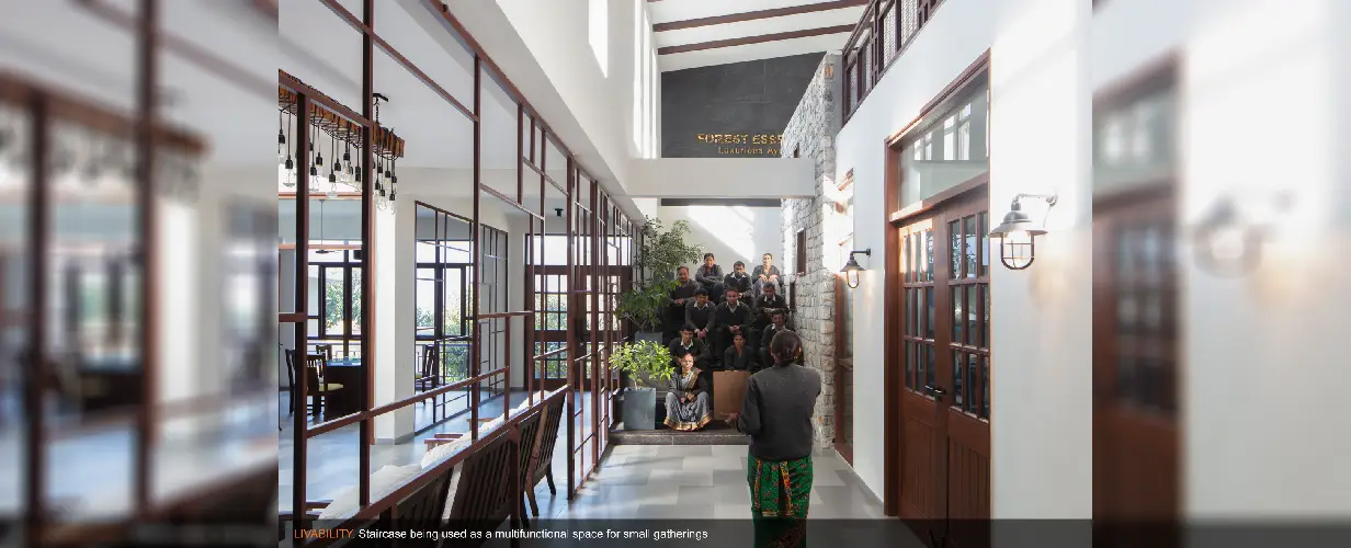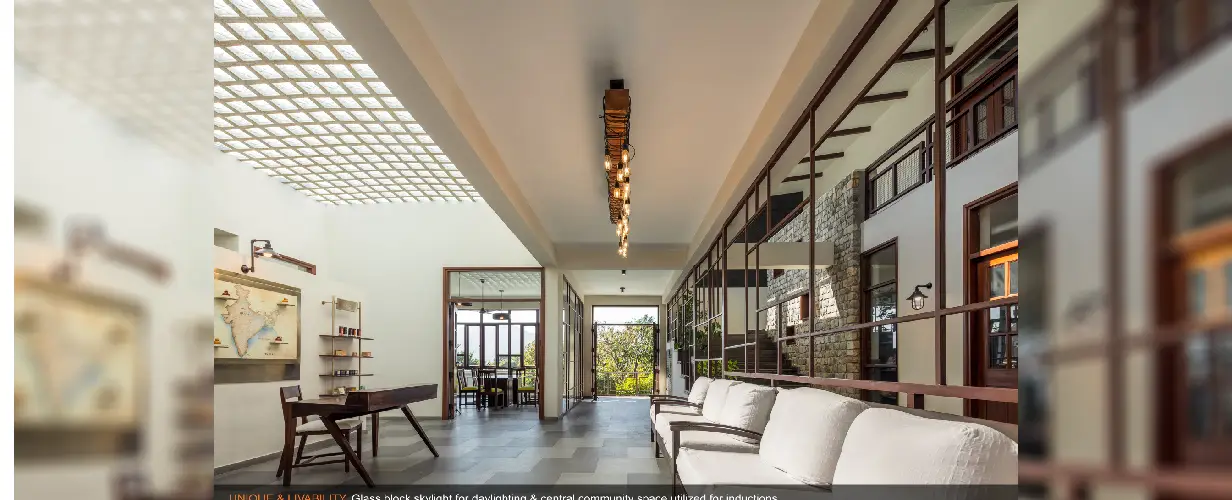 Sustainability: The built form draws inspiration the traditional ‘Kholi’ (i.e. vernacular house) design strongly influences the built form through the implementation of passive strategies (Micro-climate creation, Natural ventilation, thermal mass, glazing optimization, and façade shading) making it sustainable. Façade shading, window-to-wall ratio and building materials were optimised to ensure a high-thermal mass façade resulting in an efficient building envelope with an EPI of 35kWh/m2/yr. A solar roof generating 56kWp offsets the facility’s requirements and supplies excess to the grid proving to be Energy+. A site-specific rainwater collection tank and an effluent treatment plant meets the water requirements.