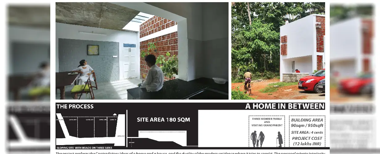Designed as a small, but big home with a limited budget on a relatively small sloping site in a warm humid tropical climate, for a lottery seller, his wife and their 5 year old son, with a grandmother visiting regularly. The project had to be completed on a limited budget of 12,00,000 Indian Rupees