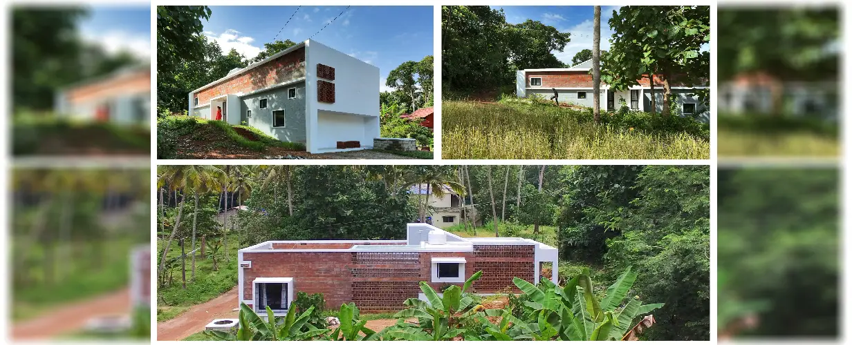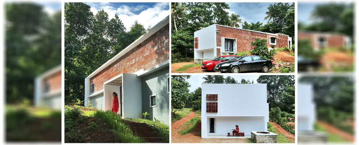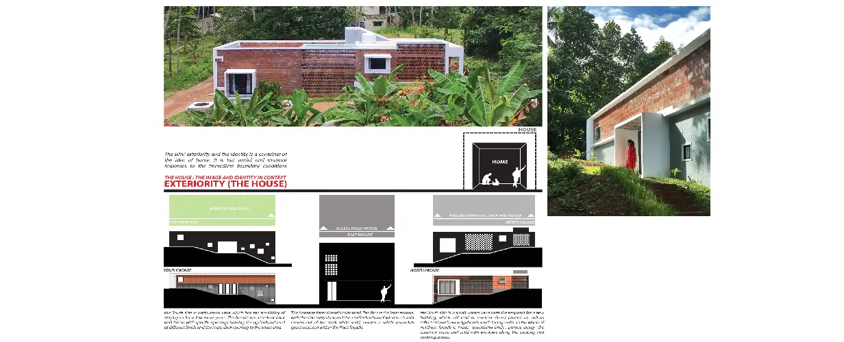The south side is agricultural land which has the possibility of staying as an unaffected open area for a few more years. The overlooking facade is an interlock brick wall with specific openings framing the agricultural land at different levels and the main door opening to the same.