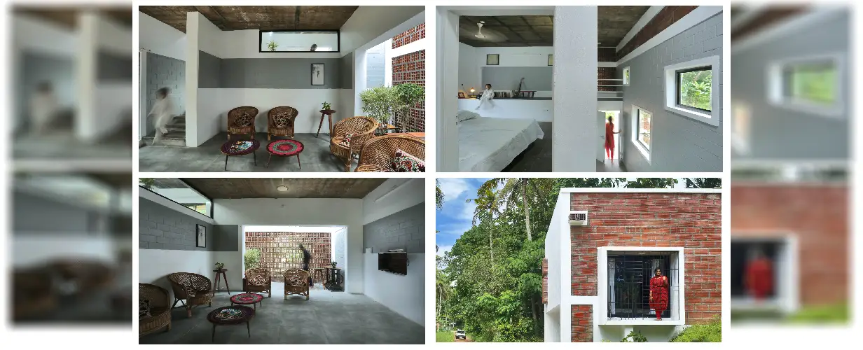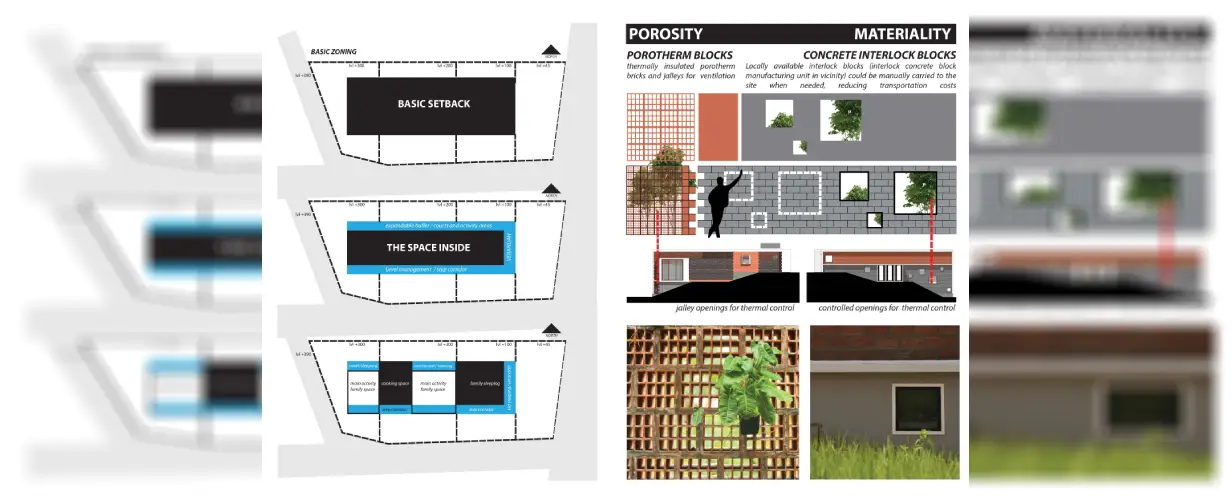 Materiality Walls: Thermally insulated Porotherm bricks for walls and jalleys, forming the skin of buffer courtyards, allowing ventilation and cutting tropical sun for thermal control. Locally available concrete interlock blocks for remaining walls with a manufacturing unit nearby to be manually carried to site