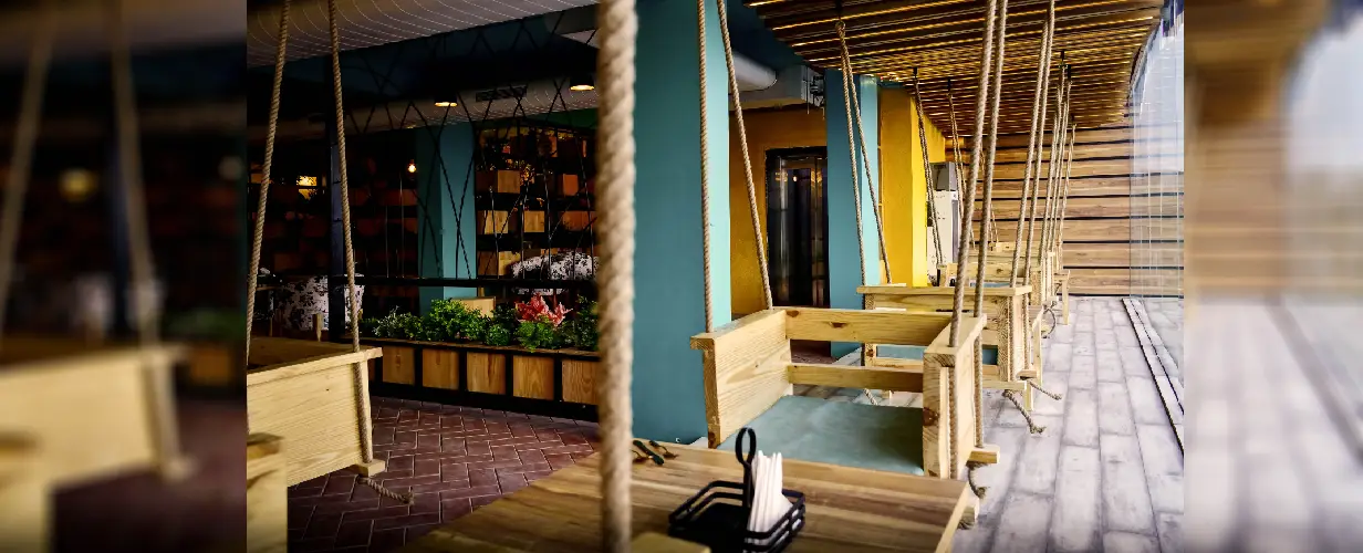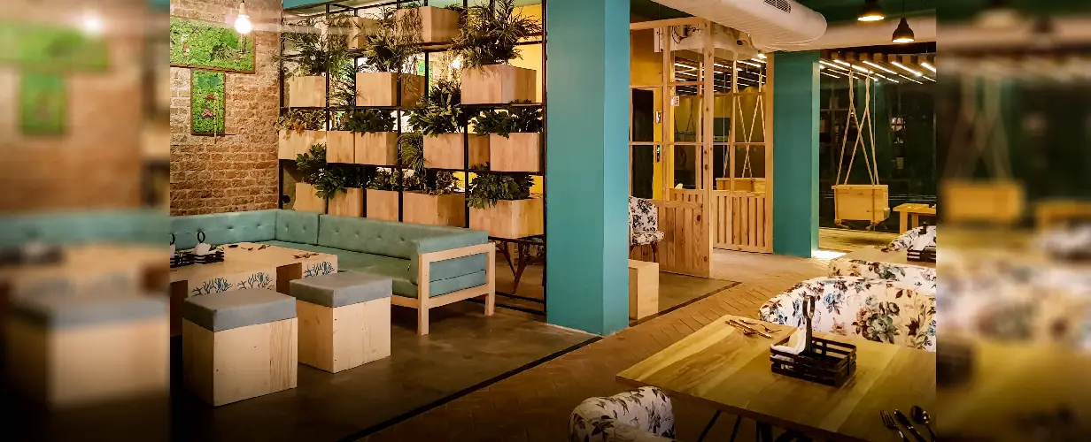 The concept is to wield the Green space in rustic themes by Natural Finishes. The intent is that every visitor feels the outdoors from inside the restaurant, this also elevates the verall vibe of the space. Consideration for Green Interior: