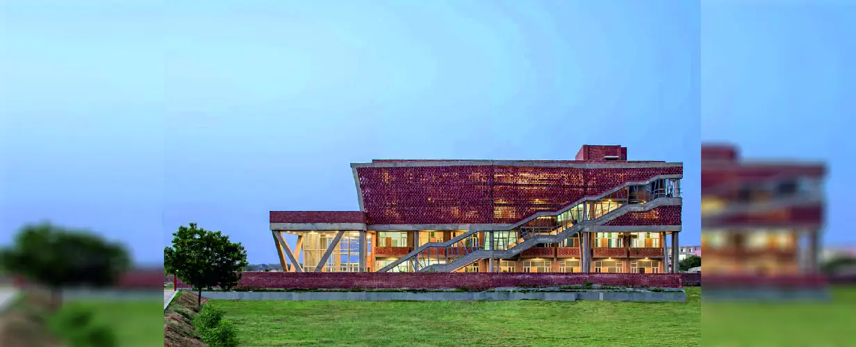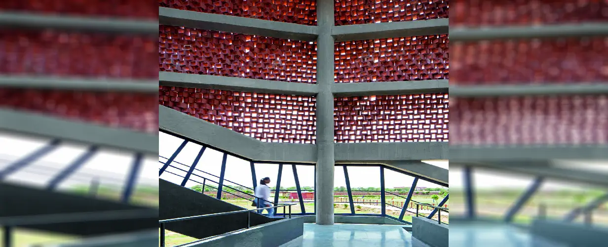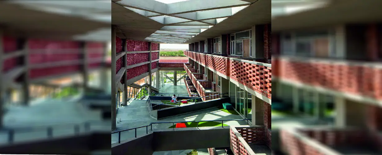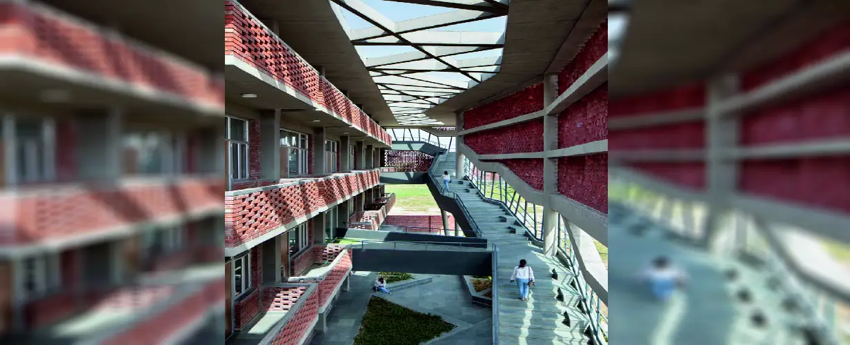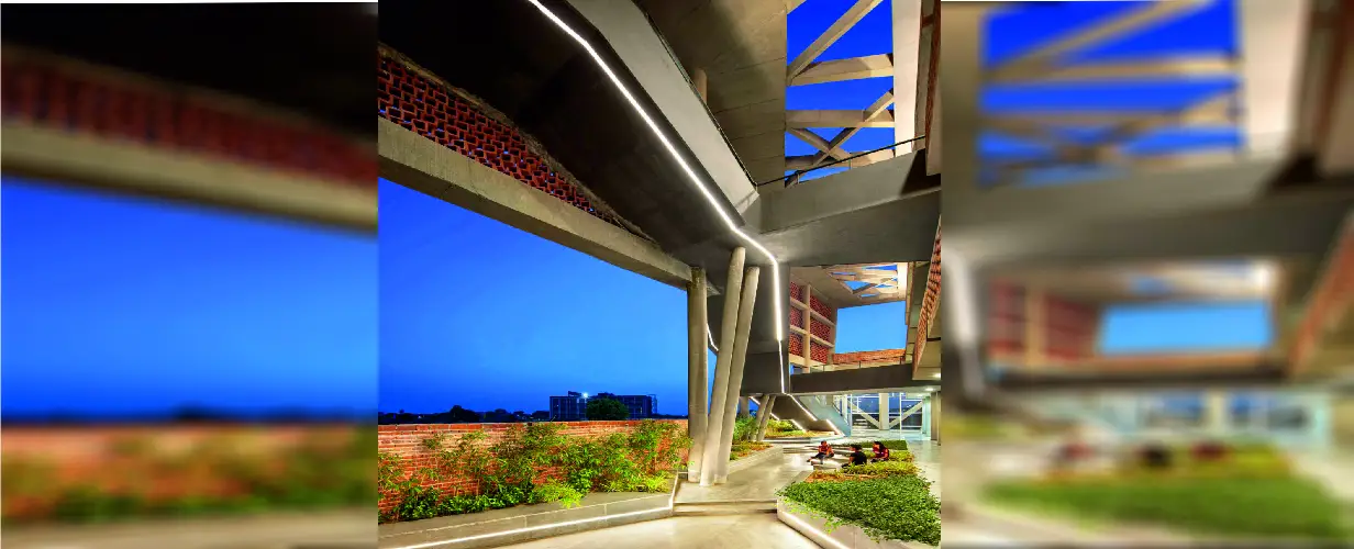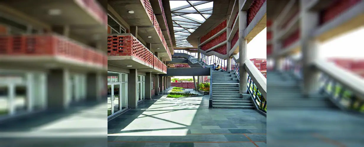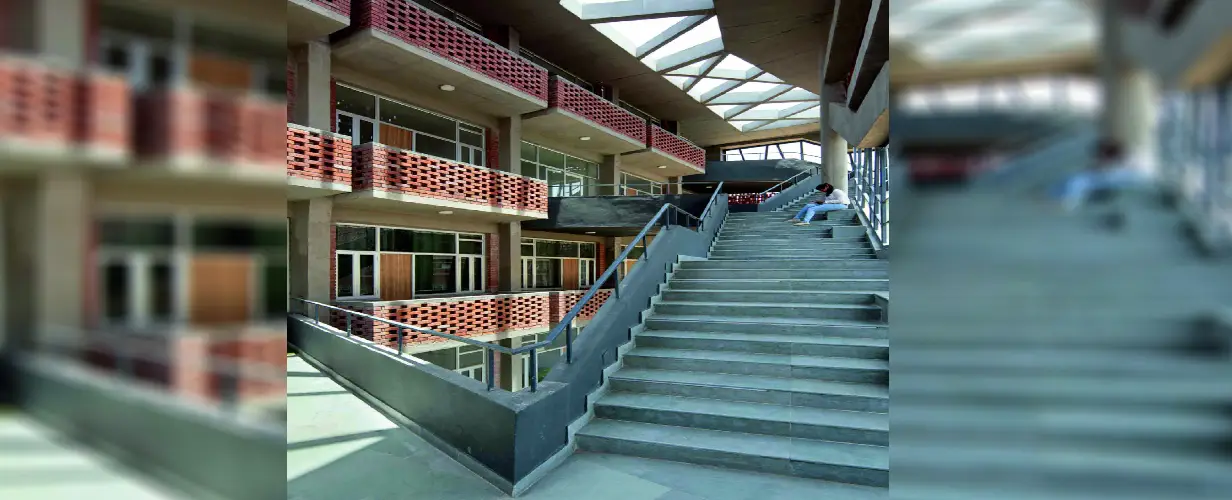 The design of the building is kept simple while identifying essential elements like the staircases as hubs for social interaction. Transitional and circulation spaces such as bridges open into lounges and pause points to create room for socializing and group study. External staircase along the facade manifests as the fundamental social nucleus that is home to all activities, from large scale celebrations and events to quick informal conversations. It serves as a social hub for interaction and helps in creating an experience while traversing. It also gives an opportunity to look outside from the building and frame views of the sky and outdoors from different angles and perspectives. The landscape design enriches the space by bringing the greenery inside to serve not only aesthetic but also functional purposes. The shaded courtyard hosts a diverse variety of plant species which require a lesser exposure to sun.