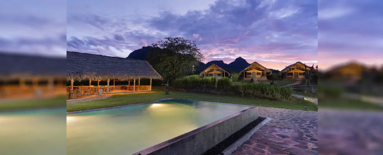 Wild Glamping Gal Oya is a semi-permanent luxury camping site that includes 03 spacious wooden tented camps for families with attached bathrooms, 07 double tented camps with attached bathrooms, an authentic linear restaurant with a curve-shaped bar and an infinity swimming pool. It is located in a 30-acre good practice agricultural farm in the Galoya Valley at Rathugala, in the Monaragala District of the Uva Province, Sri Lanka. The primary aim of the project is to improve & enhance the quality of agriculture based eco-tourism and eco-cultural tourism in Sri Lanka through a sustainable architectural approach and the property has focused on the triple bottom lines of people, plant and profits through each of these. The campsite significantly provides a unique and an out of the ordinary wild camping experience in Sri Lanka.