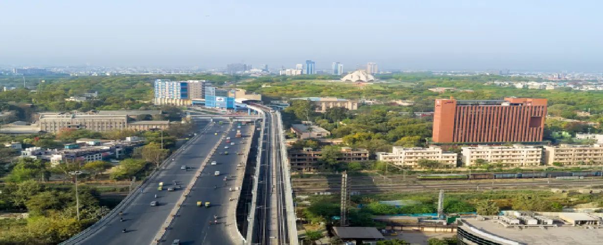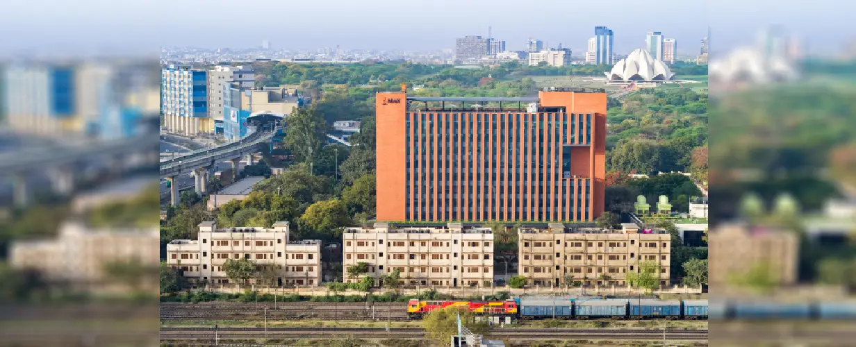 Max House is a corporate campus for Max Estates in Delhi’s Okhla, comprising two multi-tenant buildings designed to accommodate a myriad of workspaces and an existing building to be adapted into a community hub. The site adjoins a bustling thoroughfare, sitting across from an east-west metro corridor, the Modi Flour Mills and