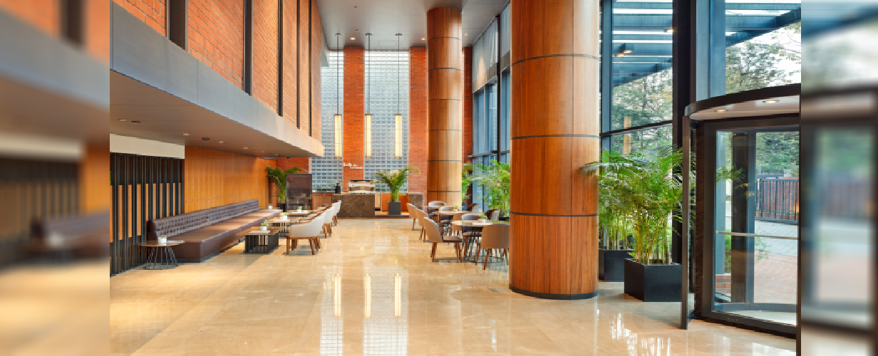 (DGU)s, is engineered to cut out glare and create a thermal buffer, lowering operating costs. As many as 82 high solar reflective index (SRI) tiles will be installed on the roof to minimize the impact on the micro-climate and reduce heat transfer through the built volume. The design scheme extends the expression of exposed brickwork into the interiors, injecting spaces with a natural, ‘handcrafted’ appeal. While brickwork and glass blocks create the retro-chic approach to the interiors of the triple-height lobby, neutral tones of stone and veneer imbue the surfaces with understated elegance.