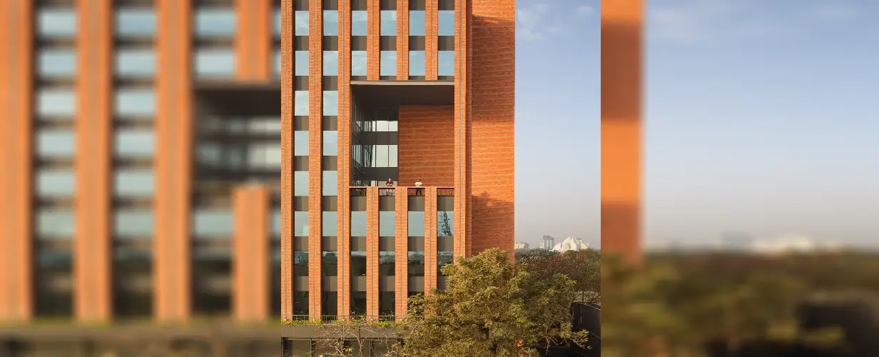 The façade is composed of hollow brick masonry, insulated spandrel panels, and double-glazed glass units are engineered to cut out glare and create a thermal buffer, significantly lowering operating costs.