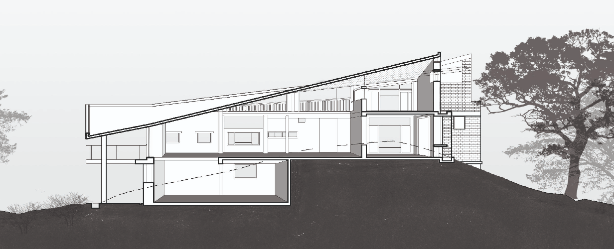 Section develops by scooping out a rectangular void at the plateau’s edge. The dialogue with landform commences through this inceptive act of the imminent built-form making an imprint into the topography. Into this, floors, walls & columns are introduced to form the core of the house. Finally, the hyperbolic paraboloid roof is modulated to follow the natural gradient of the ground below.