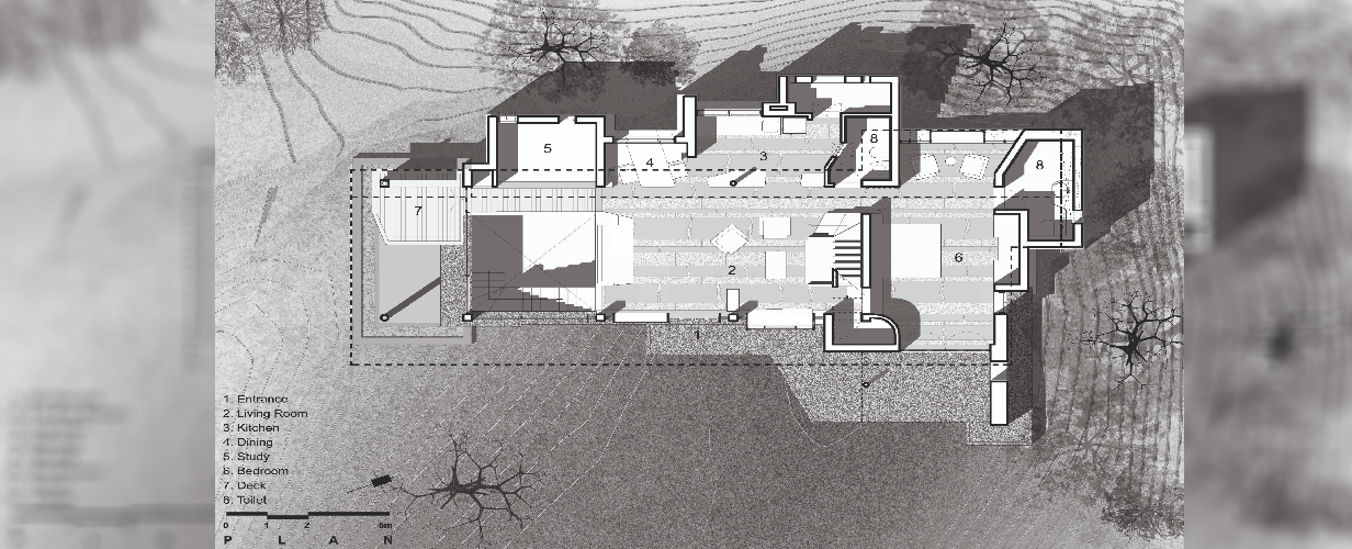 A thick retaining wall courses zigzag along the plateau’s edge to stabilize the building on its slope. It forms compact, room-like spaces which accommodate services- kitchen, dining, wash-yard, toilets, storage, etc. In contrast, a large columned hall, covered from top by a hyperbolic paraboloid, exposed RCC roof, is developed towards the river facing edge. This continuous, loggia like space across different levels supports living, sleeping, etc. The work’s key organizational move involves developing these entities- the room and pavilion- through a dialectic play between opposing conditions of hillside v/s riverside view, sunset v/s moonrise, service v/s served space, etc.