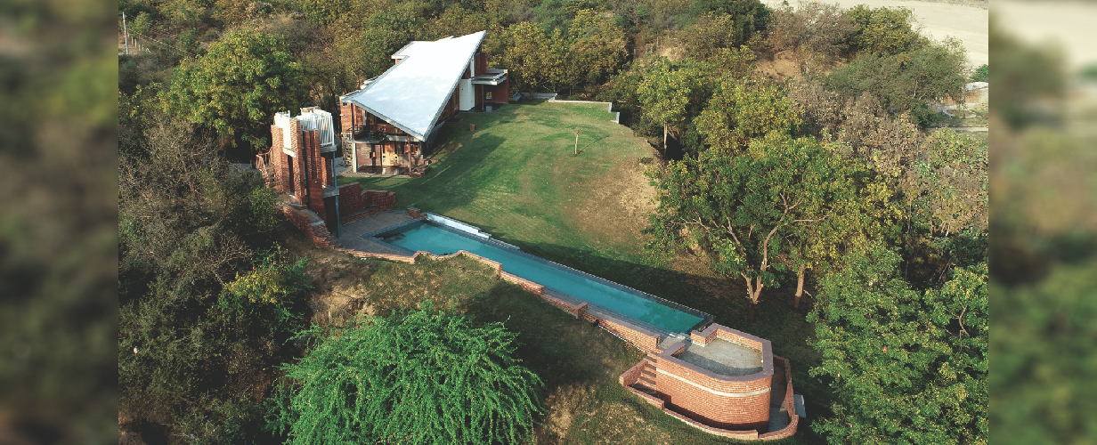 Project was an opportunity to engage with a pristine, forested site, located on the banks of Sabarmati river near Ahmedabad. Shaped by the region’s riverine landscape, the undulating site is approached from the north and included a plateau- 15M from the water level- towards its western edge. From here, the site sloped down eastwards as one approached the river’s edge. All constructional decisions were made to preserve the original land form and ecology of the site with limited interference.
