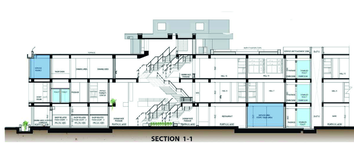 campus with built to edge design conditions this facility termed as arcade on central vista shall house basic day to day need in terms of essential shopping, food court zone, student activity centre, common community facilities for students as well as faculty, staff, students’ art centre, informal