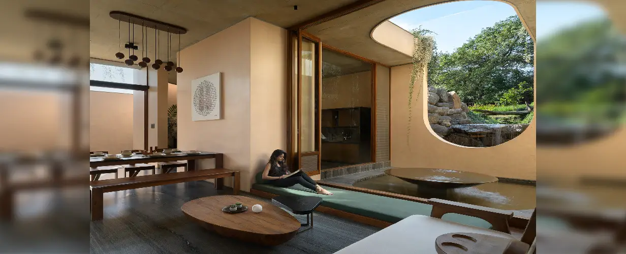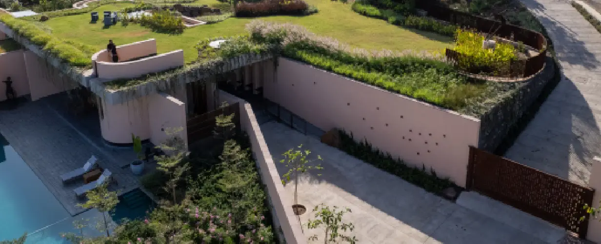The house has been set within the site so as to not overpower its surroundings. The design has been made climate conducive by creatively altering the topography on the west side to allow natural air and light, creating a flow of cross ventilation. Special sculptures have been commissioned to be placed at strategic intersecting axes that marry art and architecture. The house frames uninterrupted views of the dam, while also creating private pockets and spaces for contemplative meditation.