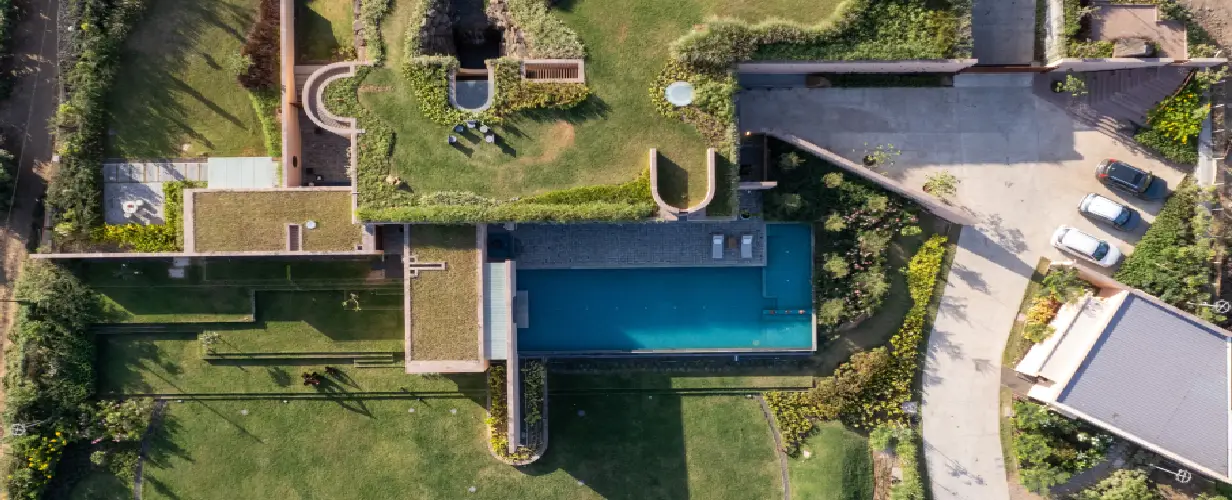 Cascading down through a series of pedestrian steps, the forecourt of the house gets defined by the first line – a wall with a long slit that frames the dam against the green. It directs us into the covered portico bending us into the direction of the entrance. As one enters, a big view of the pool opens up, bounded on the right by the second principal wall that playfully layers the house and connects to the water stream that runs beyond in the back.