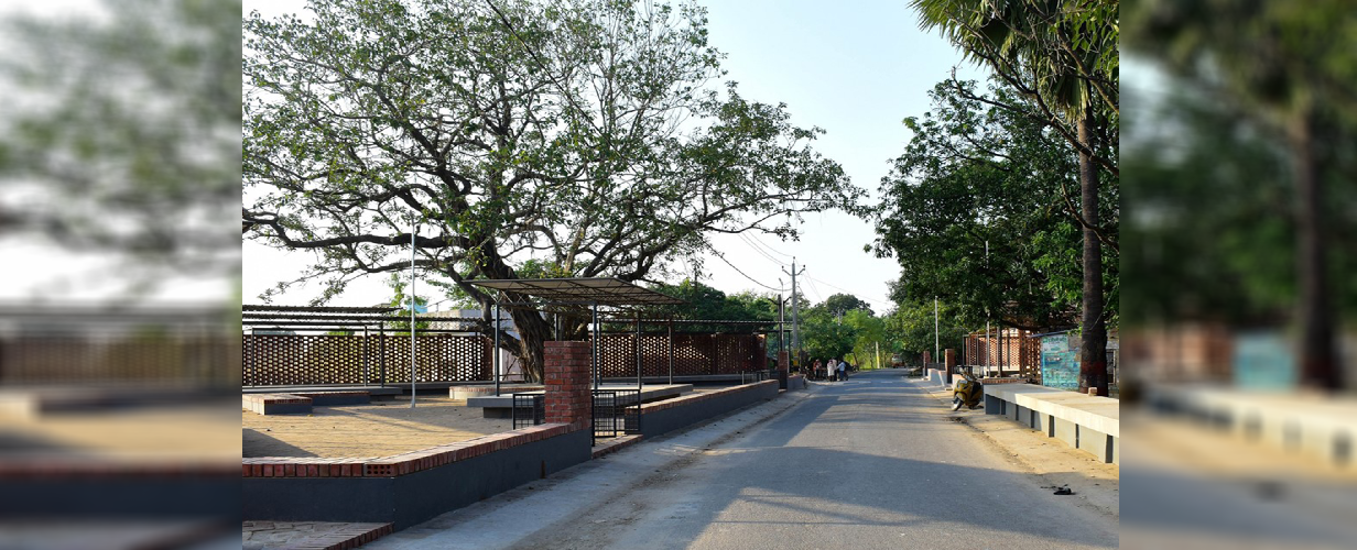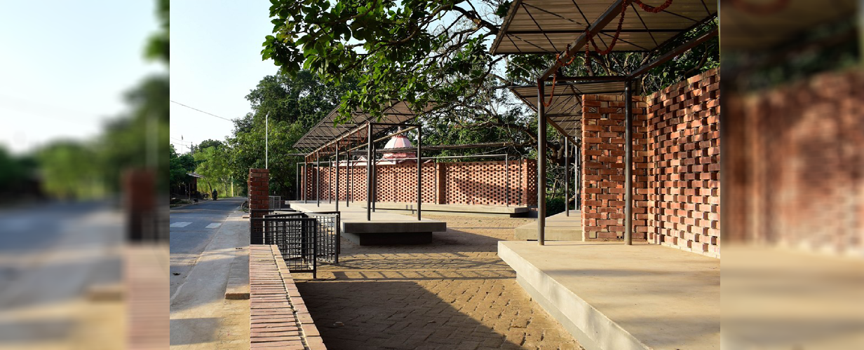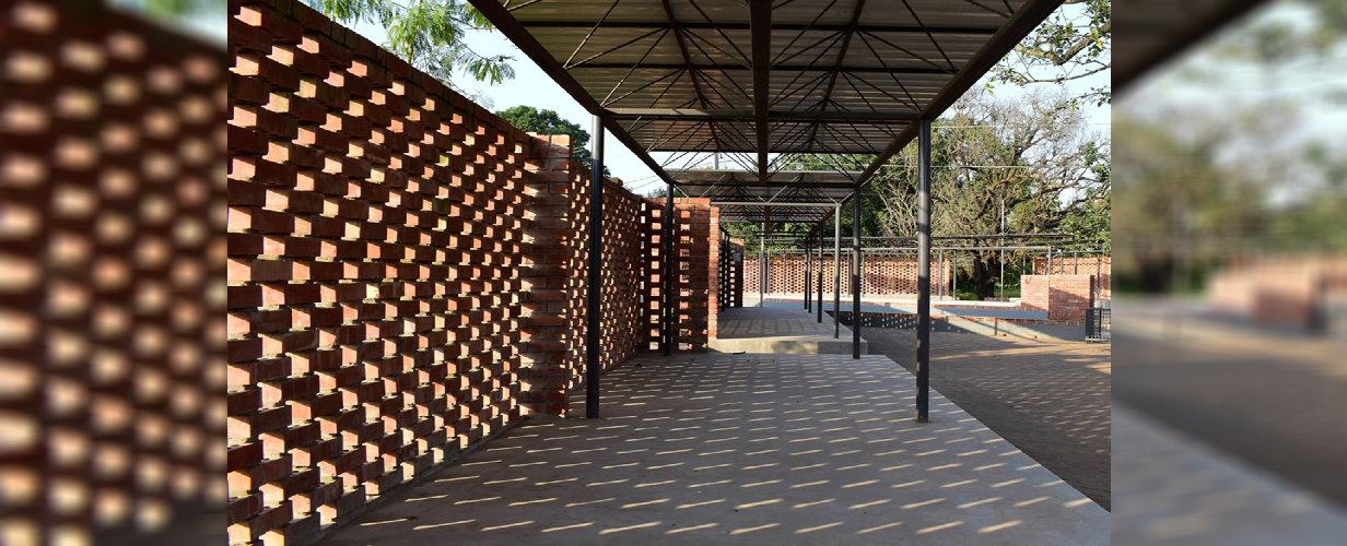 Existing trees on site including an age-old banyan tree have been incorporated in the design; also serves as a place for the market and community to gather around. The wire- cut brick jali allows one to see through to the other side making the structure visually open and light.