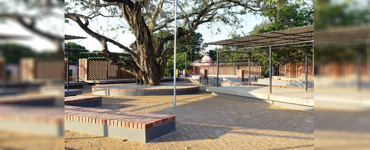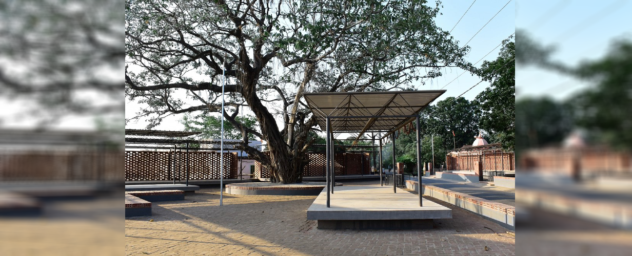The project had to be value-engineered for a very cost-effective and replicable model. The detail of a ‘space-frame’ was explored using affordably available reinforcement steel in a recurring pyramidal geometry. This helped us to reduce the cost of the fabricated roofs significantly and the surplus was committed to better paving, landscaping, and enclosure in the form of wire-cut bricks. The platforms were carefully designed to create an equitable distribution as different vendors had individual and specific requirements of space. The heights were also adjusted to facilitate comfortable exchange. The brick screens protect the plaza from the west sun while the enormous banyan tree was celebrated.
